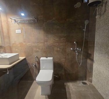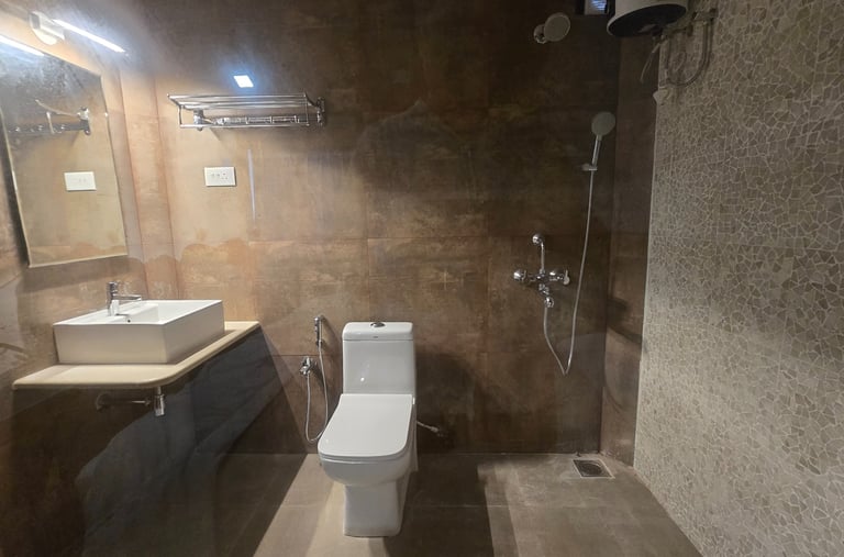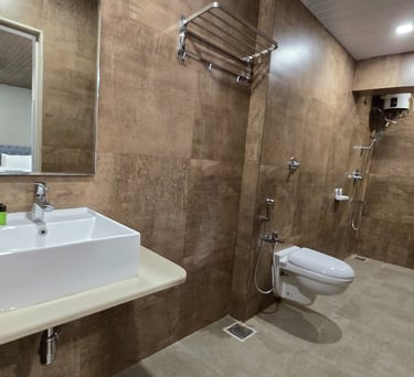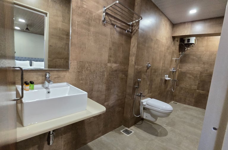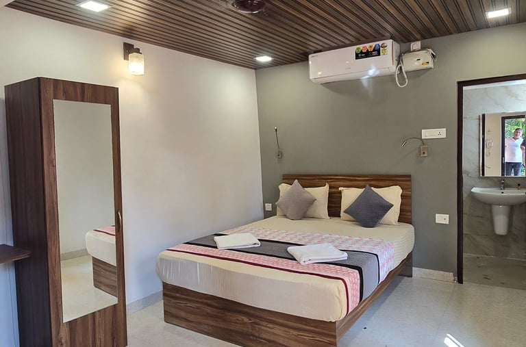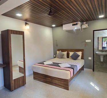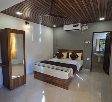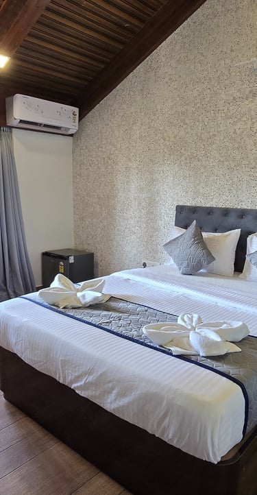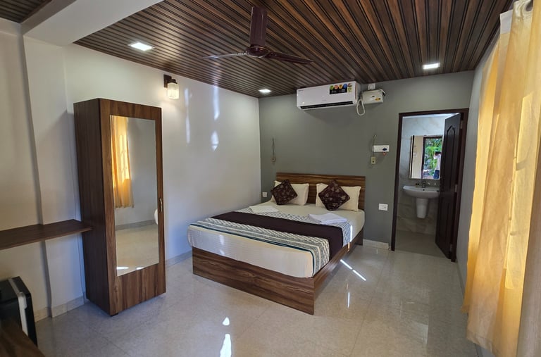 Step into over 200 sq ft of thoughtfully designed comfort in our Standard AC Rooms, perfect for a relaxing stay in the heart of Colva. Each room features elegant wall tiling and tasteful décor, creating a serene ambiance for guests. Enjoy modern amenities including a private ensuite bathroom, a flatscreen TV, and a convenient mini fridge. and hair dryer.