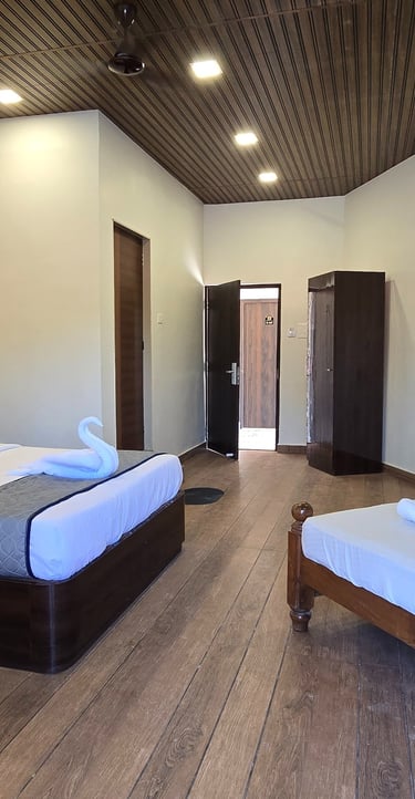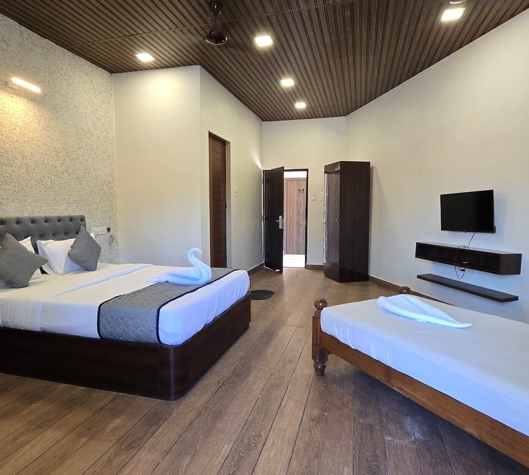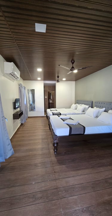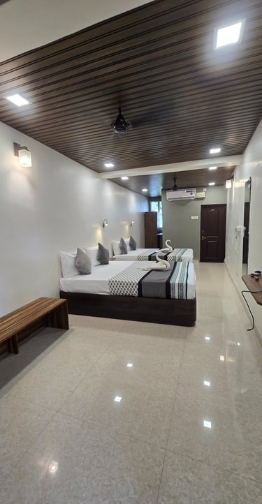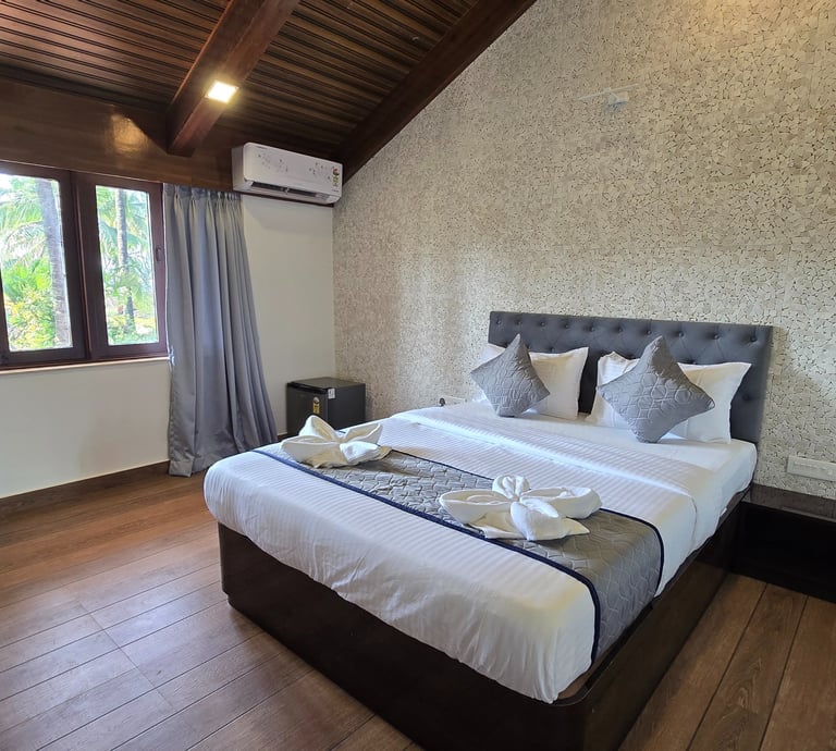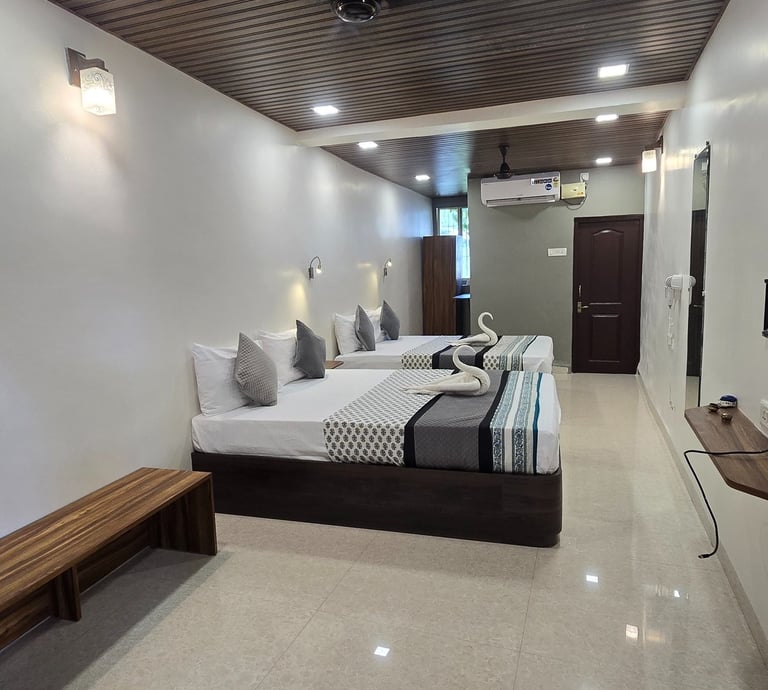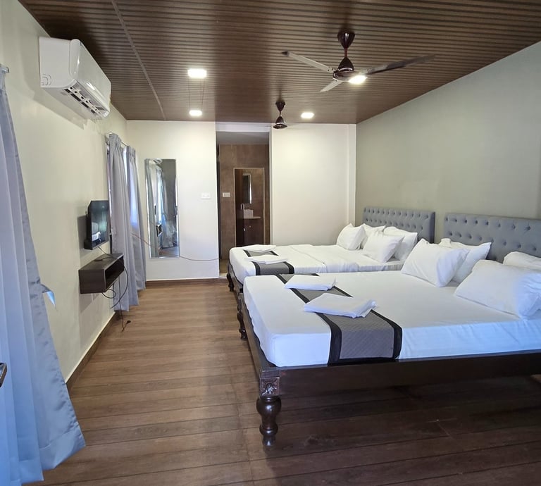 Experience laid-back luxury in our Deluxe AC Rooms at M Beach Resort, designed to comfortably accommodate up to three guests. Each room features a stylish ensuite bathroom and a private balcony where you can soak in the tropical breeze. Tastefully decorated with coastal accents and warm tones, these rooms offer a serene escape just moments from the beach. Whether you're traveling with family or friends, enjoy restful sleep, modern amenities, and the charm of South Goa in every detail.